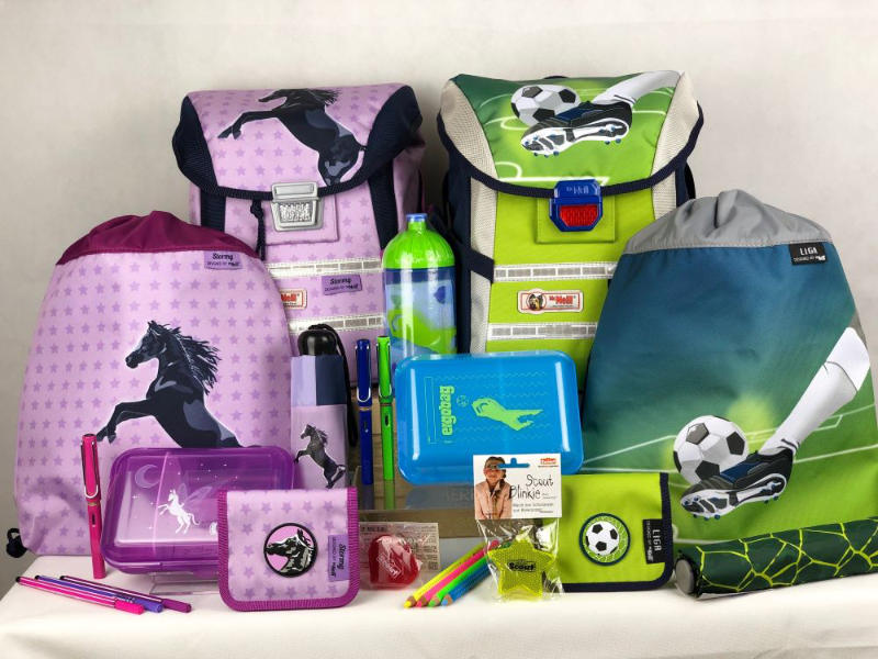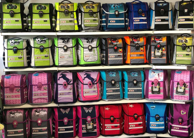 Eine Wand mit verschiedenen bunten Schulranzen, sortiert nach Designs und Farben.