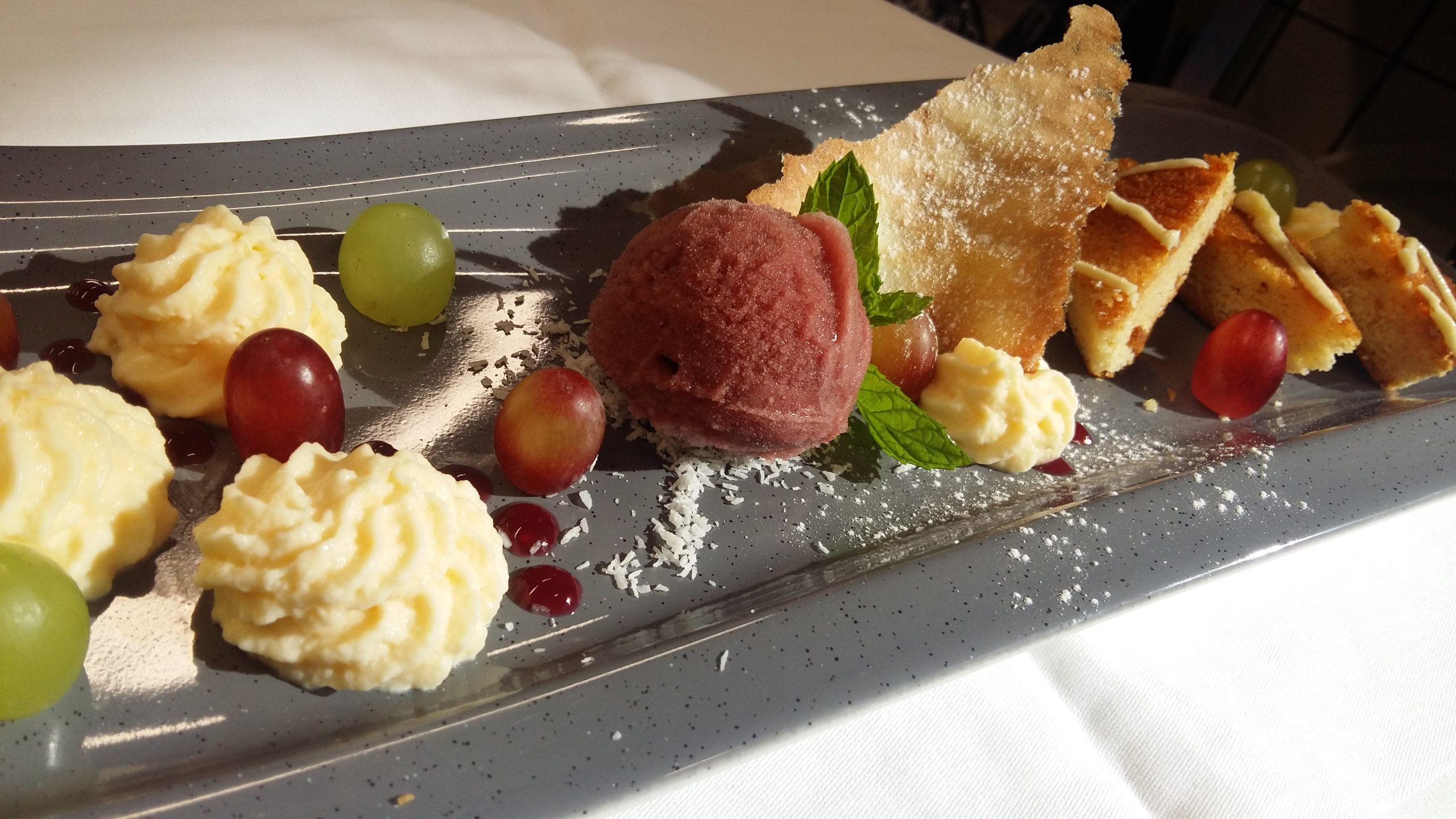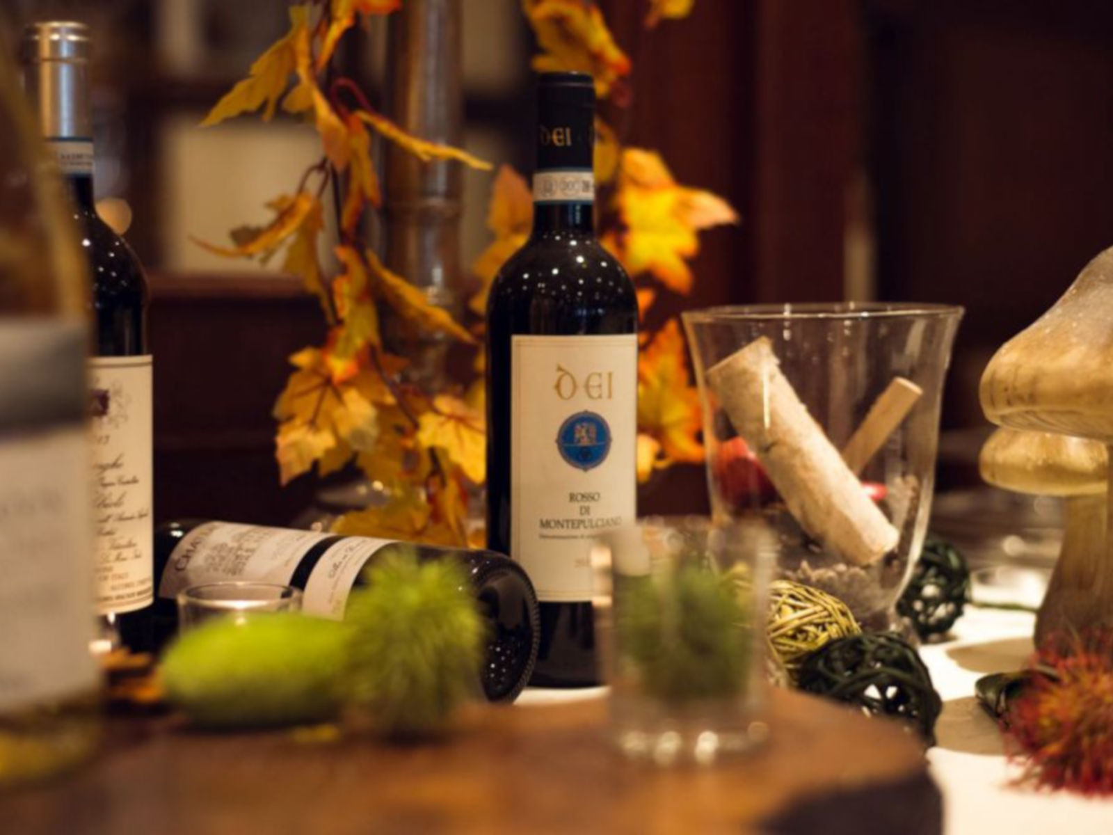 Stillleben mit Weinflaschen, Gläsern, dekorativen Elementen und buntem Herbstlaub auf einem Tisch.