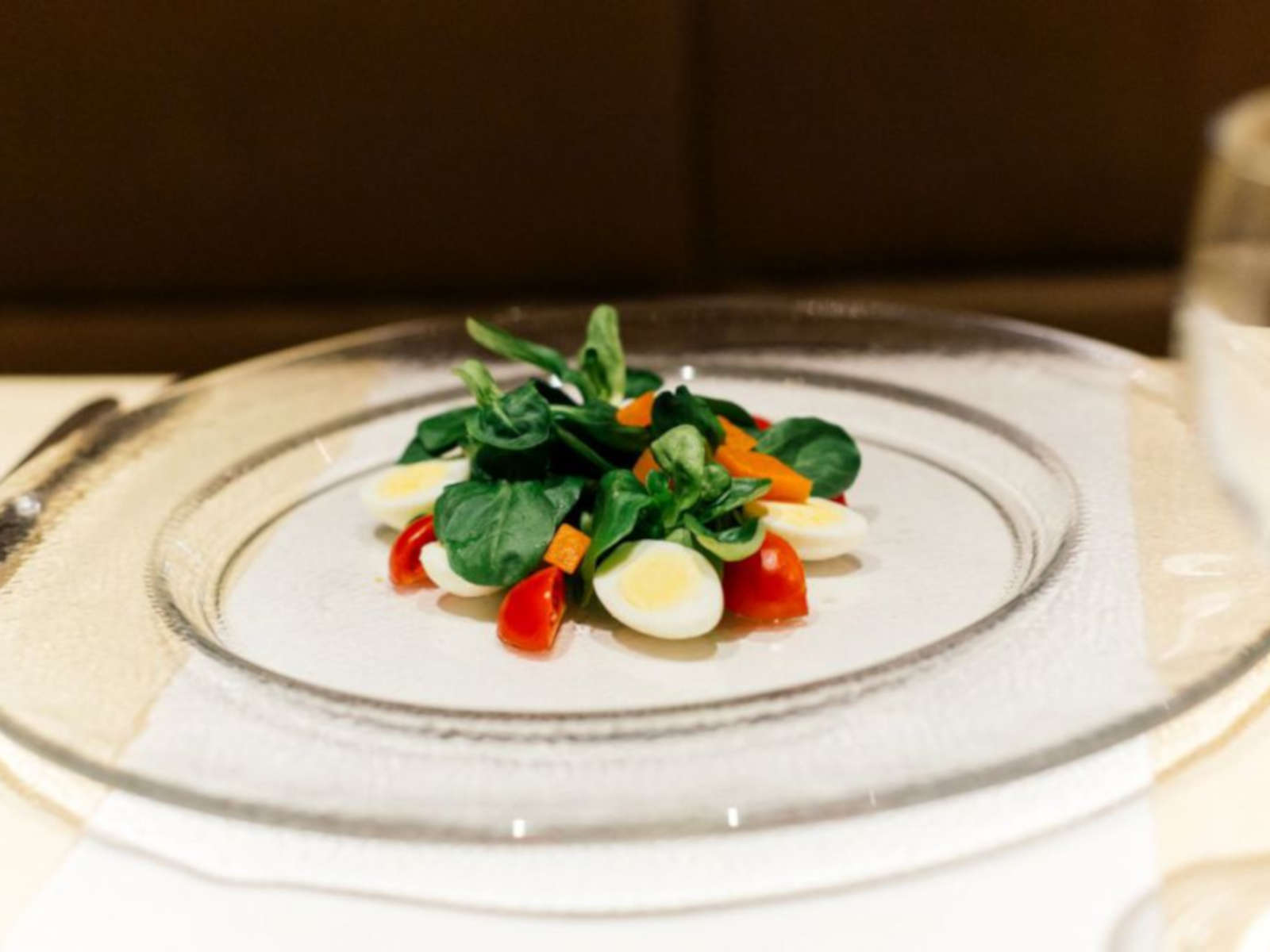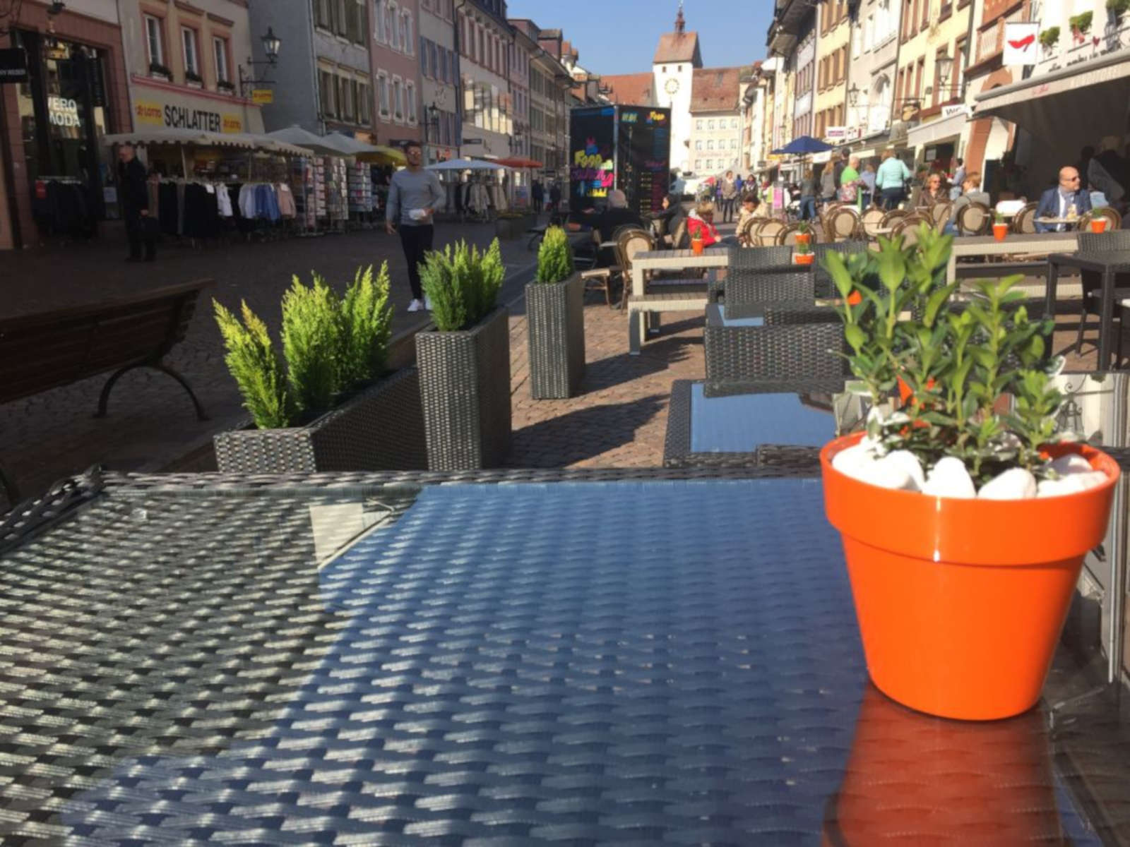 Historische Straßenansicht mit gepflegten Gebäuden, einem Uhrenturm und leeren Terrassen in sanfter Morgenbeleuchtung.
